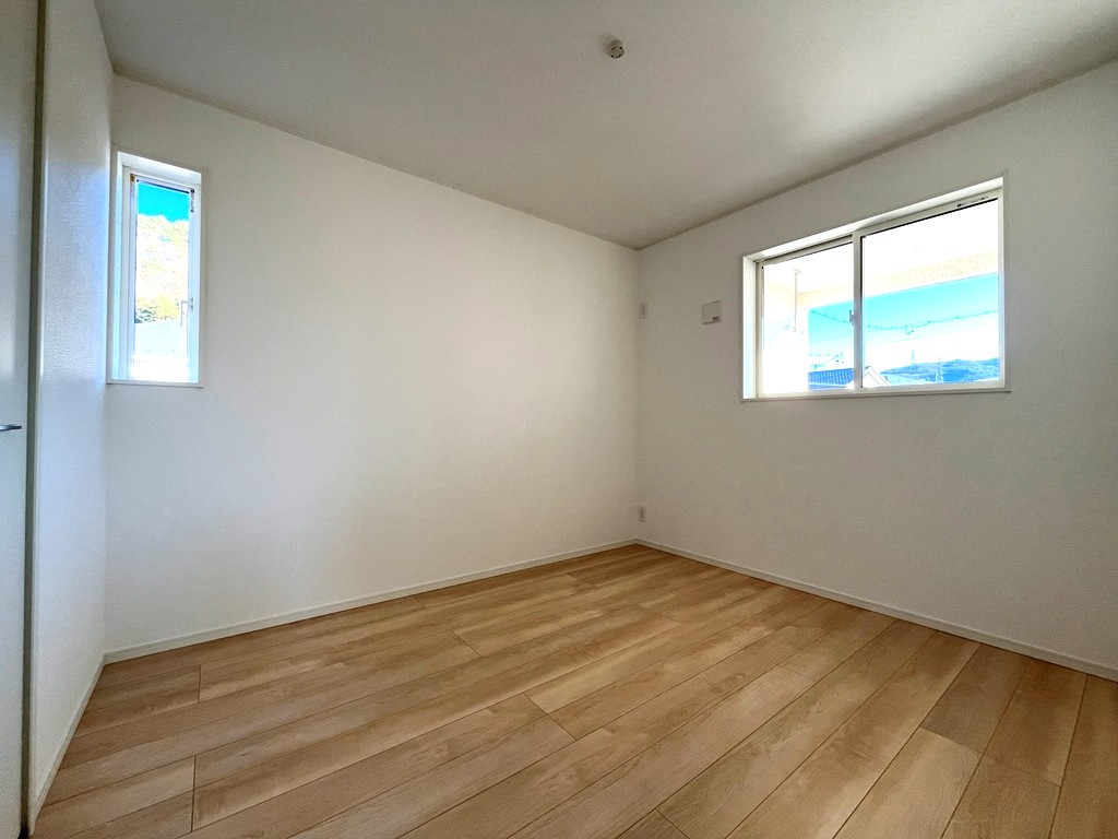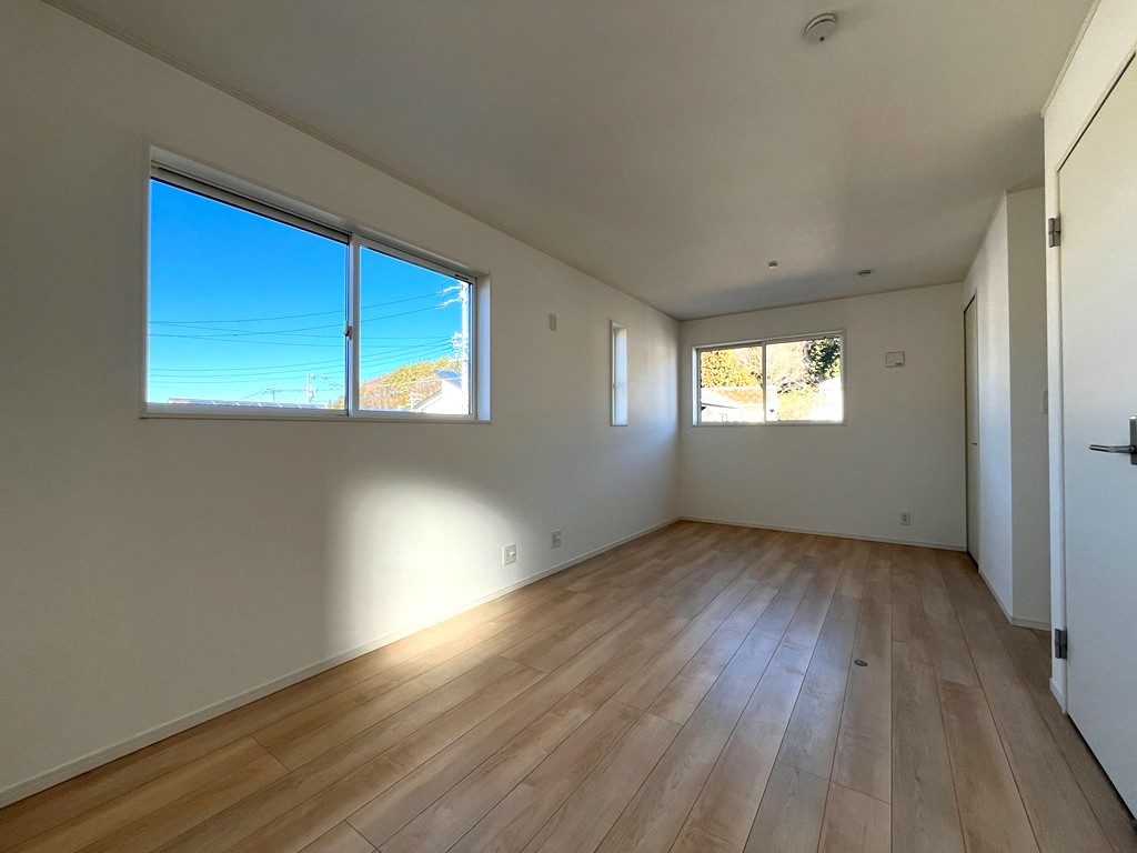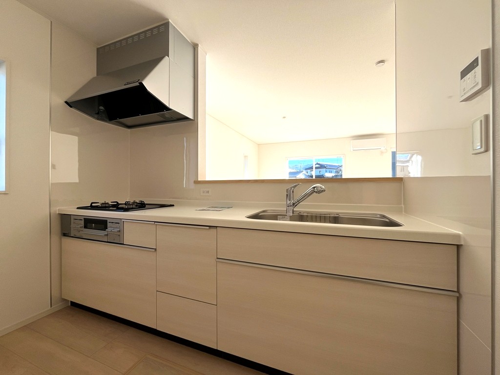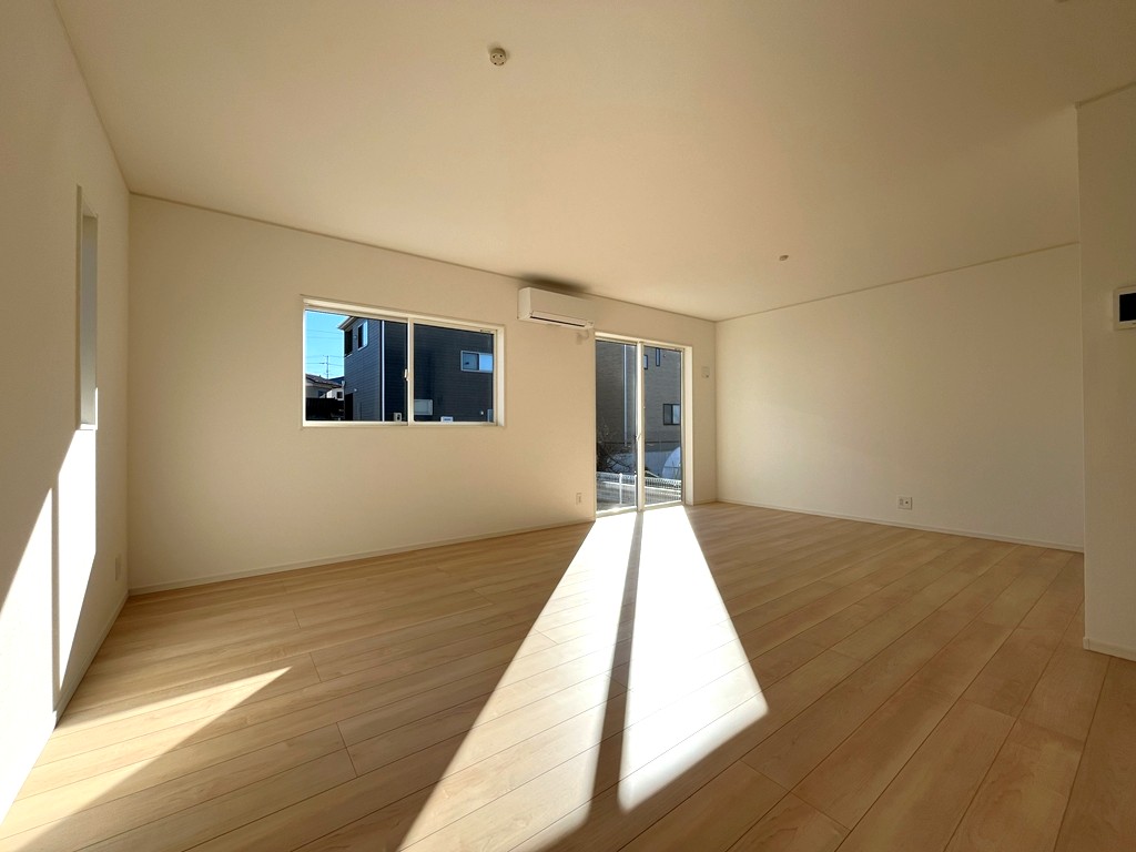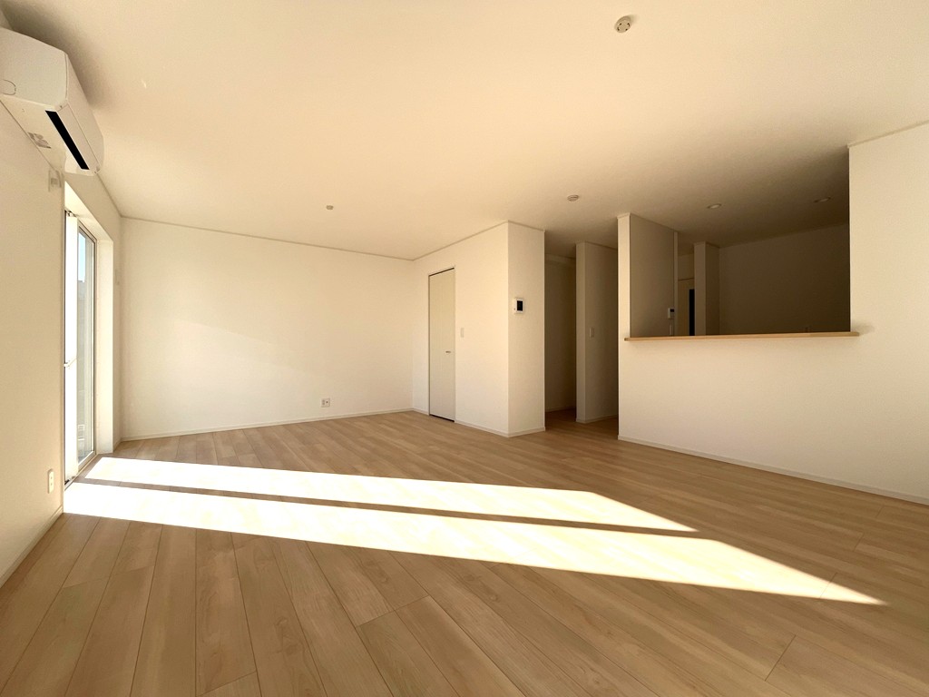 LDKは20帖の広々空間。対面キッチンを採用し、家族の様子を感じながら家事ができる開放的な設計です。日当たりも良好で、明るい室内が毎日の暮らしを心地よく整えます。全室洋室・全室収納付きで使い勝手にも配慮されています。
