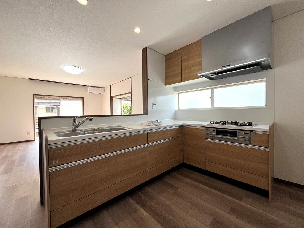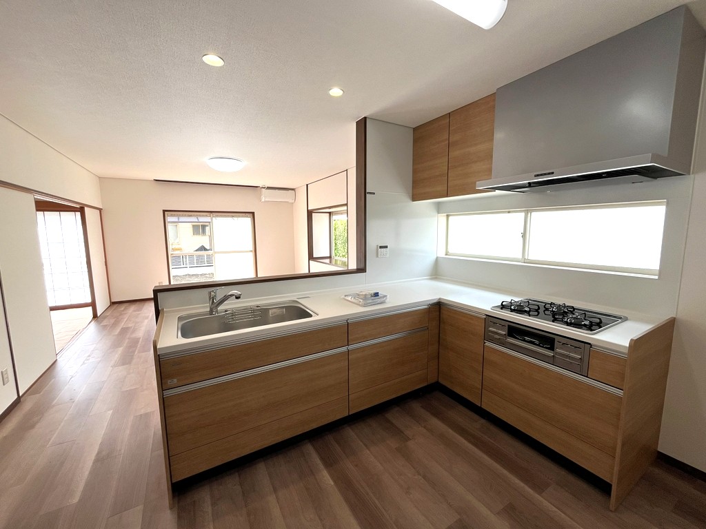 リフォームで生まれ変わった都市ガス仕様の中古住宅。水回りは新品、16.5帖のLDKに使いやすいL型キッチン。全室6帖以上+WIC付でゆとりの間取り。キッチン横に土間スペース、駐車2台可。