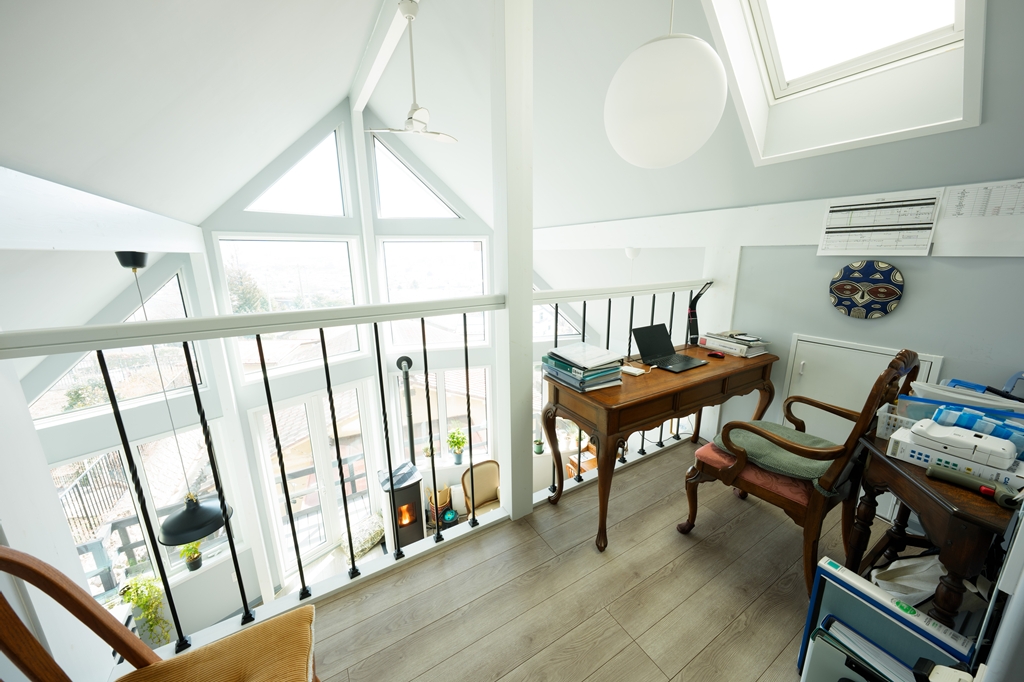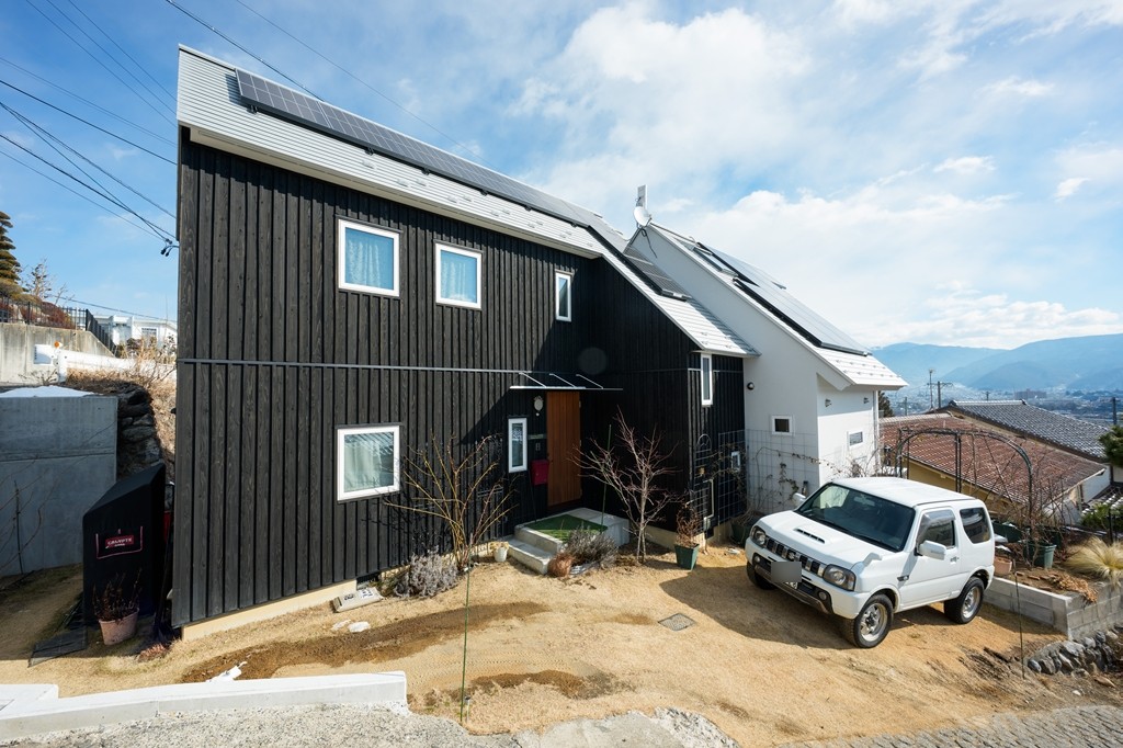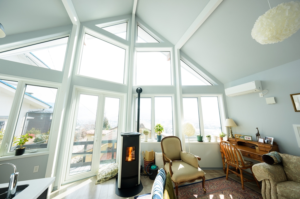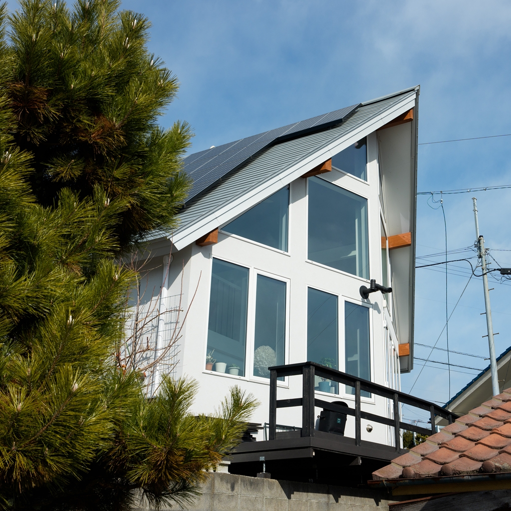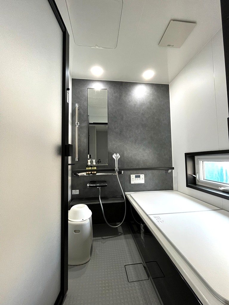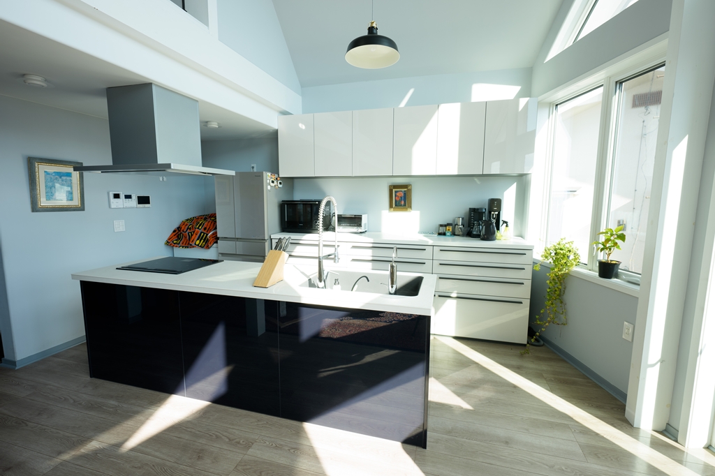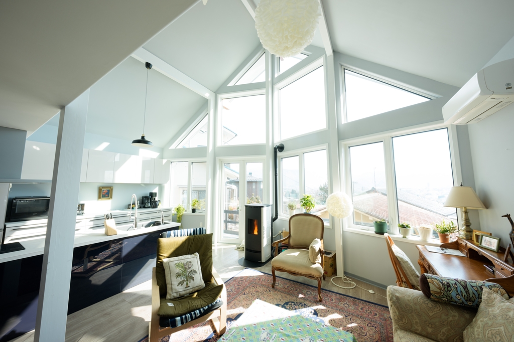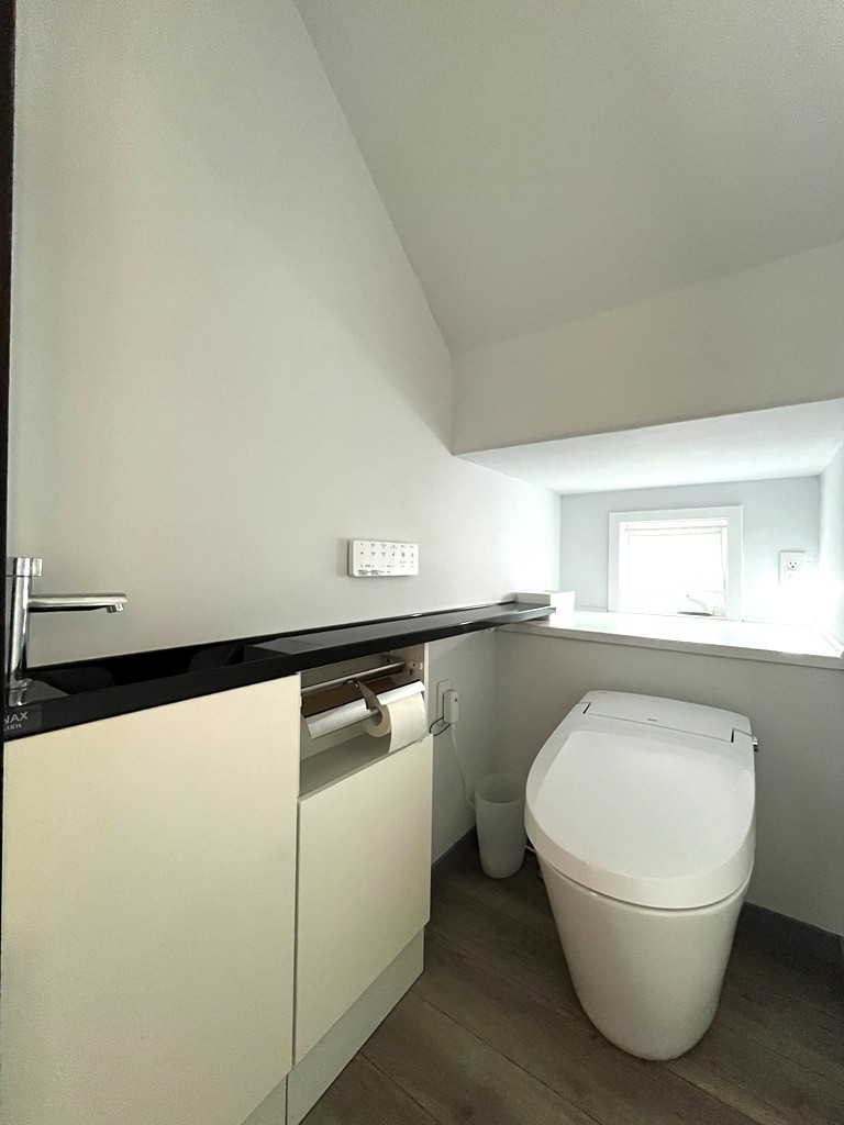 【建物】木造枠組壁工法(一部2×4・2×6)。外壁・屋根下断熱材の内側に気密シート0.2mm施工。屋根下は高性能グラスウール180mm、外壁140mm、床下はXPS(押出法ポリスチレンフォーム)90mmを採用し、高い断熱・気密性能を確保。屋根は耐久性に優れたガルバリウム鋼板、外装は杉板(防腐塗装)+一部塗り壁仕上げ。窓はPVC枠Low-Eペアガラス(アルゴンガス入)、玄関は輸入断熱ドア。内装はドライウォール塗装仕上げ、床は木製フロア12mm厚。