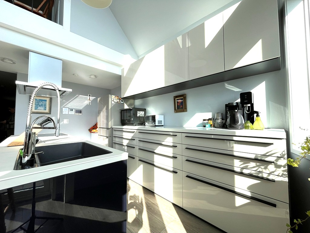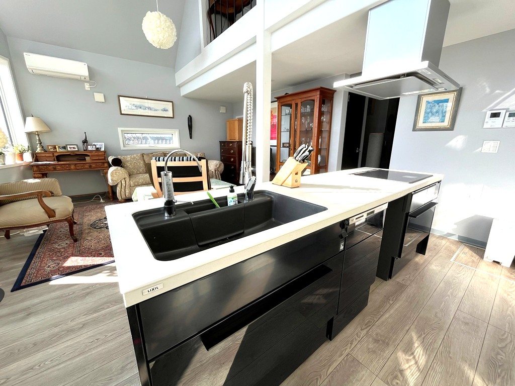 【設備】LIXILキッチン2600mm(IH・食洗機・パナソニック製浄水器、バックキャビネット2700mm)、UB1坪、洗面1200mm、サティストイレ(手洗いカウンター付)。日立エコキュート370L寒冷地仕様(追焚付)。24時間換気(第三種)、トイレ・脱衣室換気扇、各室吸気口。エアコン3台、吹抜けシーリングファン、イタリア製ペレットストーブ、モニターホン、各室照明、屋根裏収納(天井収納階段)・キッチン床下収納あり。